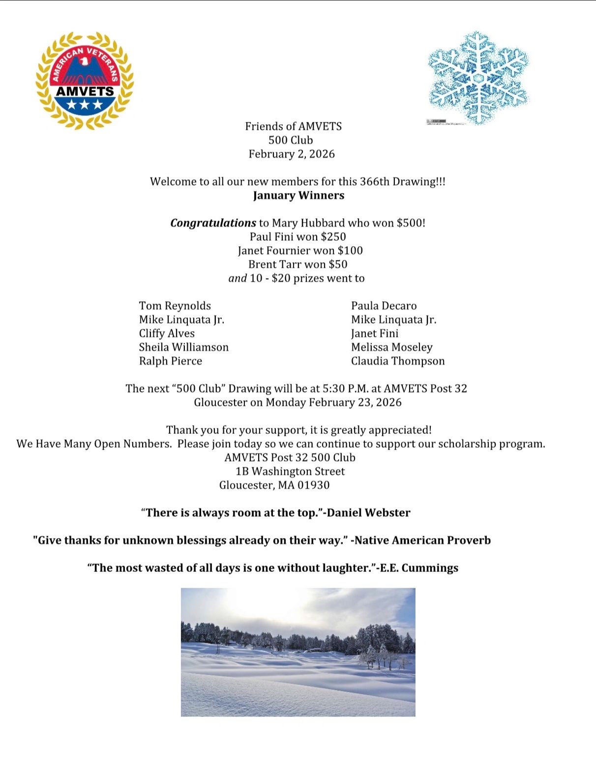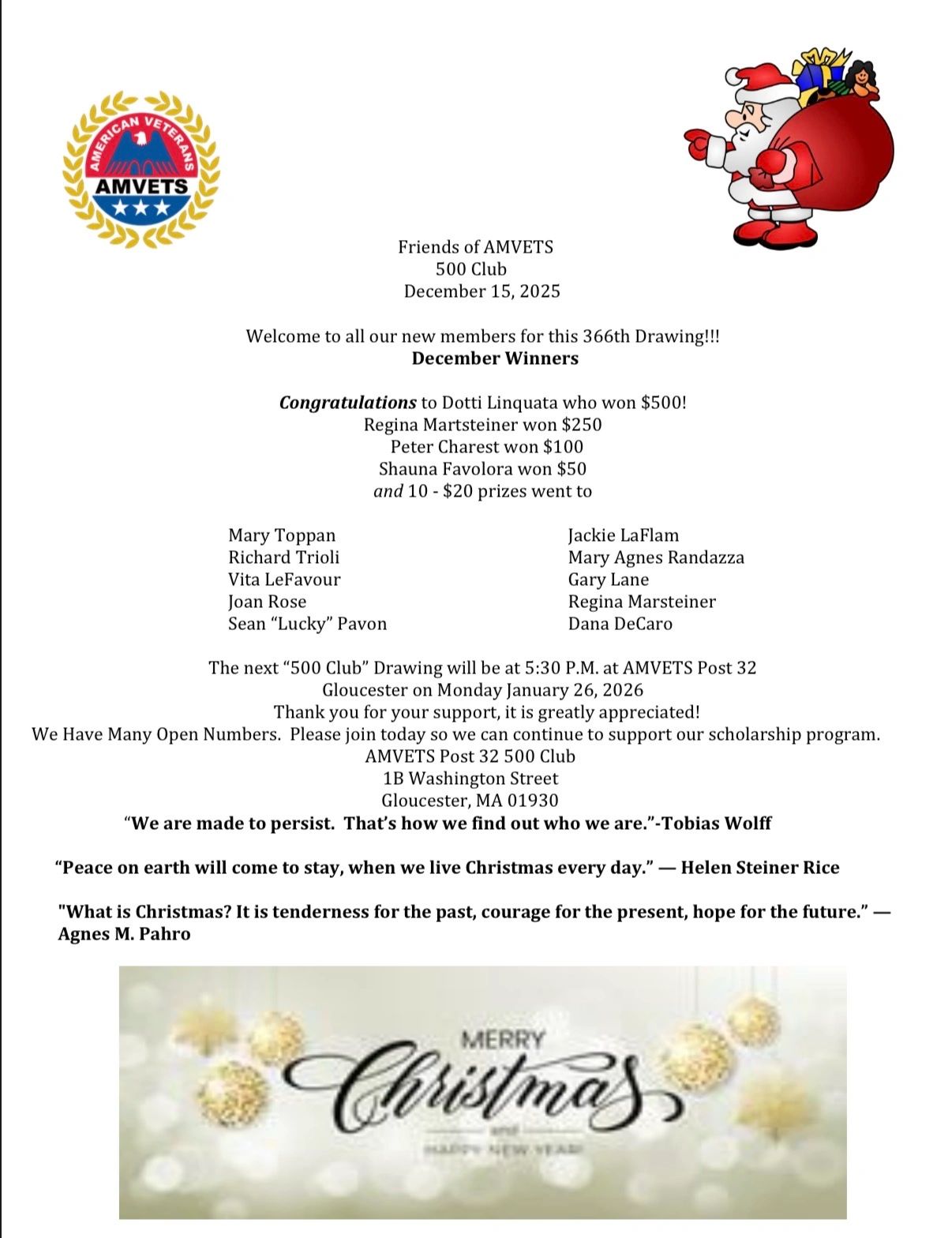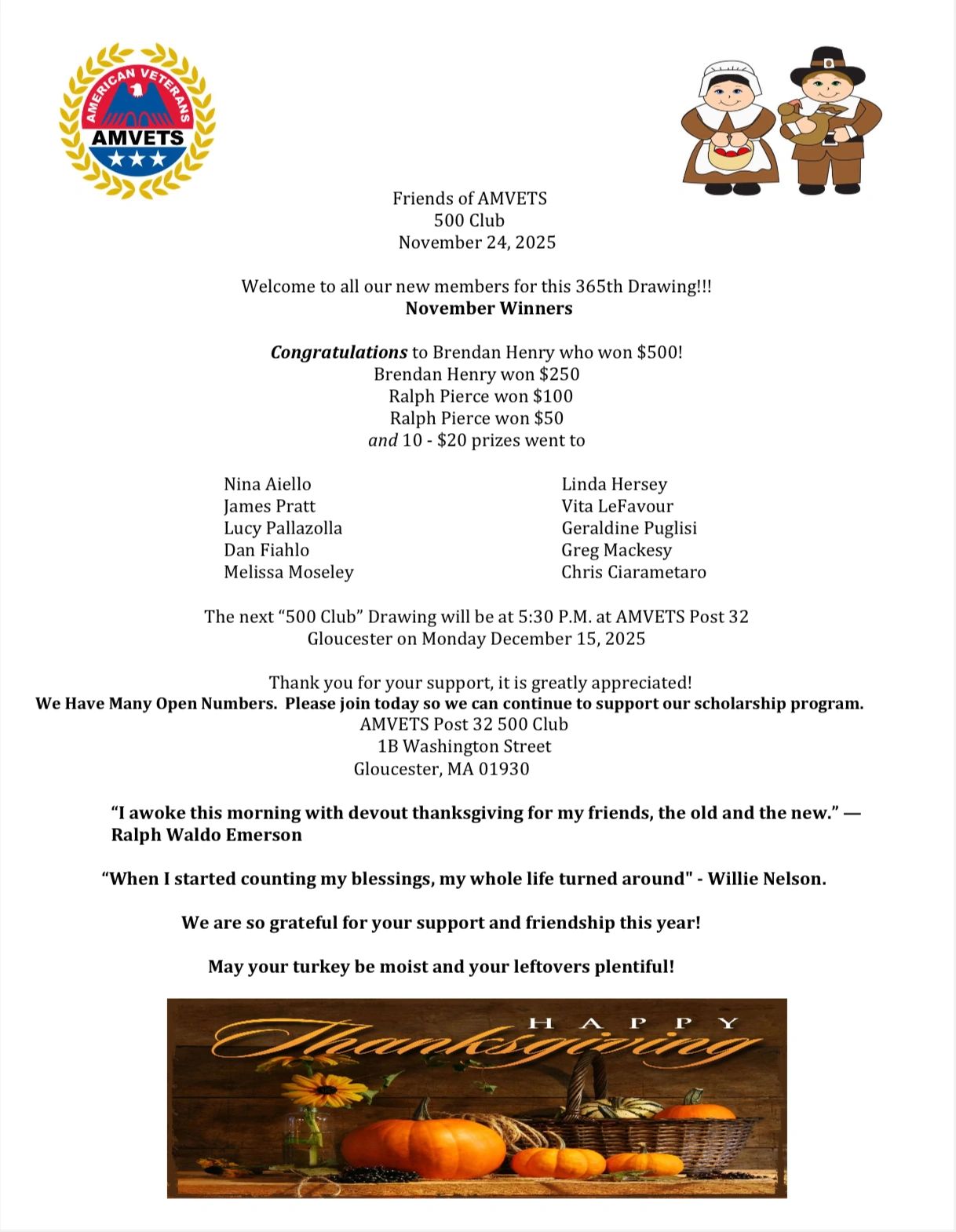 Drawings are held on the last Monday of every month at 1B Washington St., Gloucester, MA.